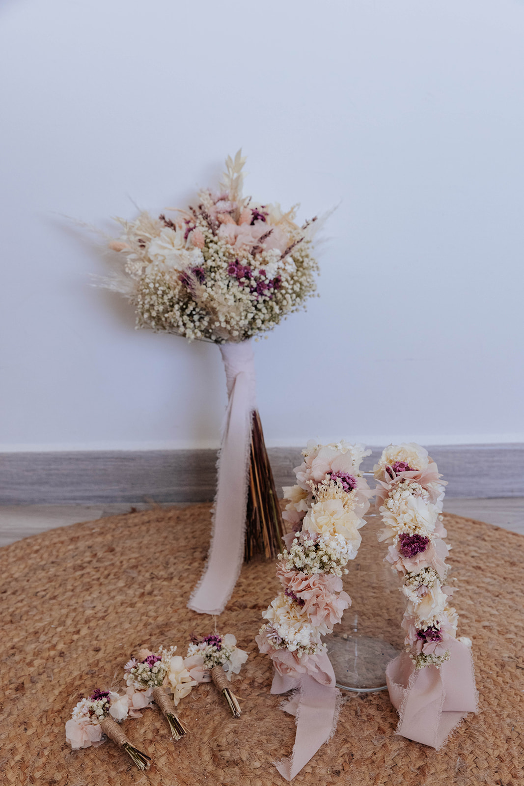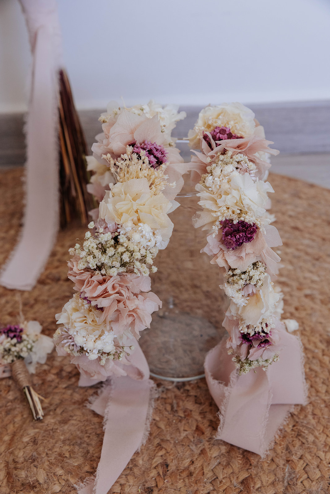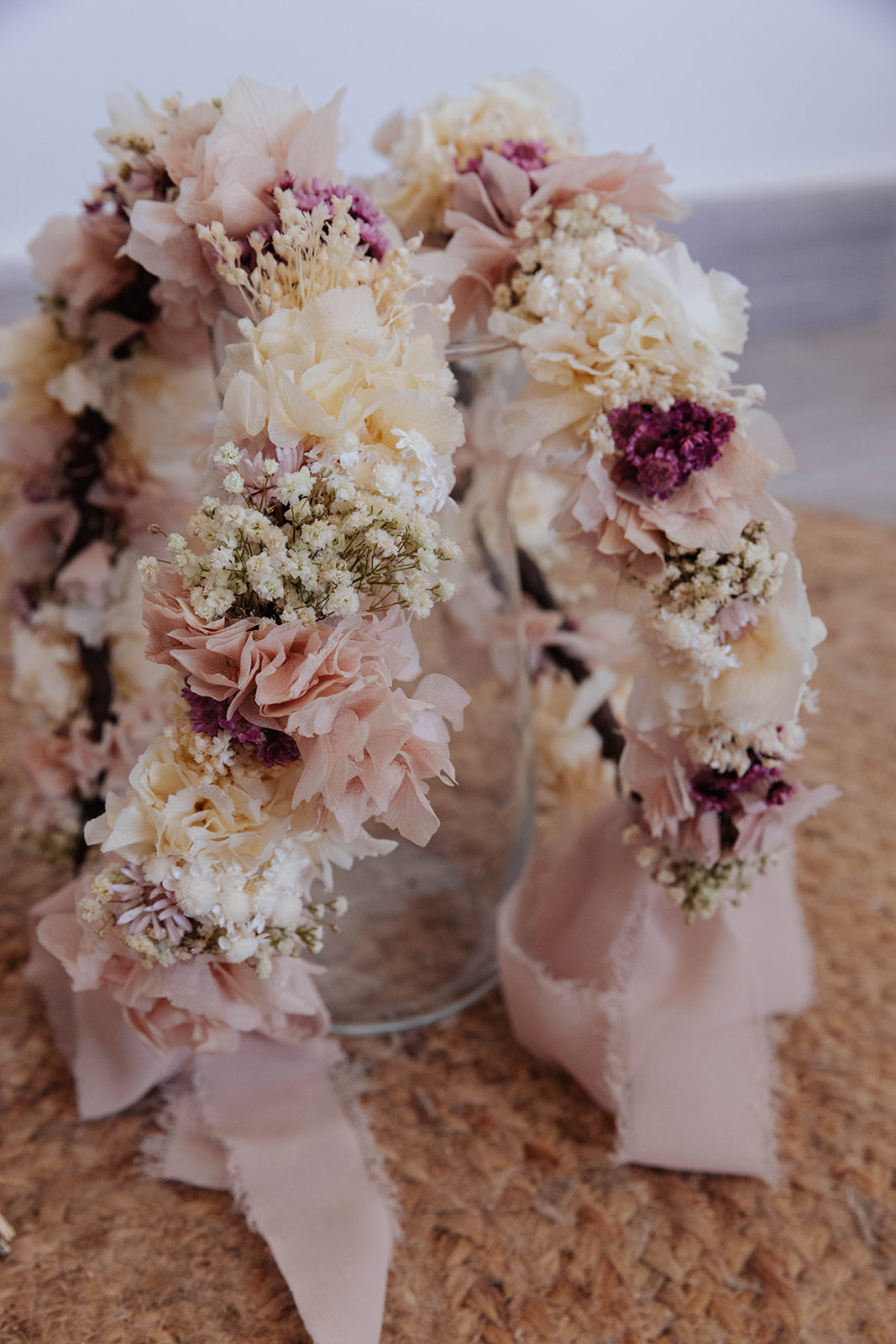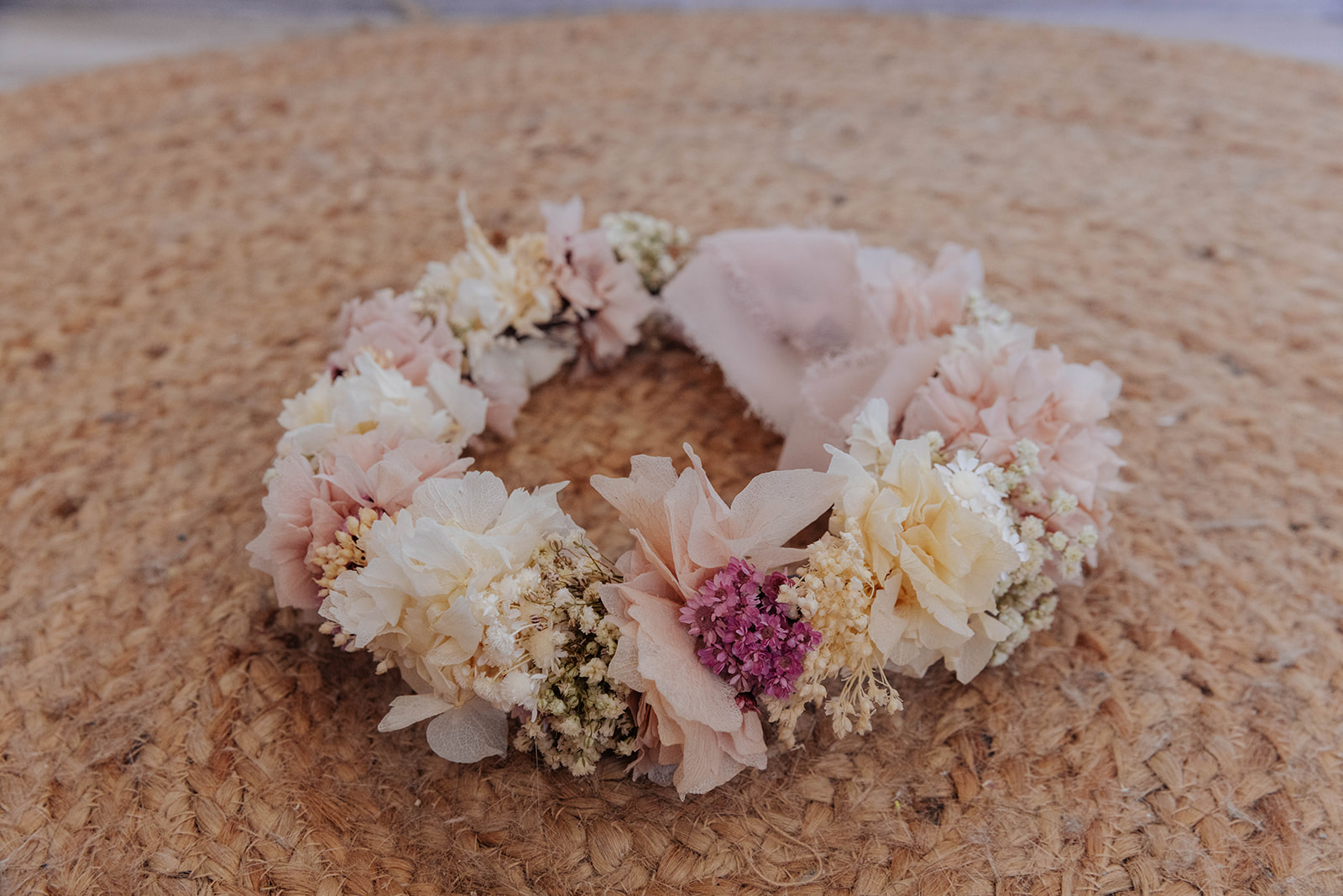 Corona de niña con flores preservadas. Nuestras coronas de niña son personalizadas, con la posibilidad e hacerlas a conjunto del ramo de novia. Importante: la elaboración de todos los ramos y complementos de novia se realizaran bajo agenda cerrada, por tanto la compra debe realizarse mínimo con 2 meses de anterioridad para reservar tu fecha boda y asegurar tu pedido. En cuanto realices tu compra, nos pondremos en contacto contigo para agendar una videollamada y conocer el resto de detalles, definir el estilo y realizar la selección final de flores. Si tienes alguna duda, o tu fecha de boda en más próxima de 2 meses ponte en contacto con nosotros antes de realizar la compra.