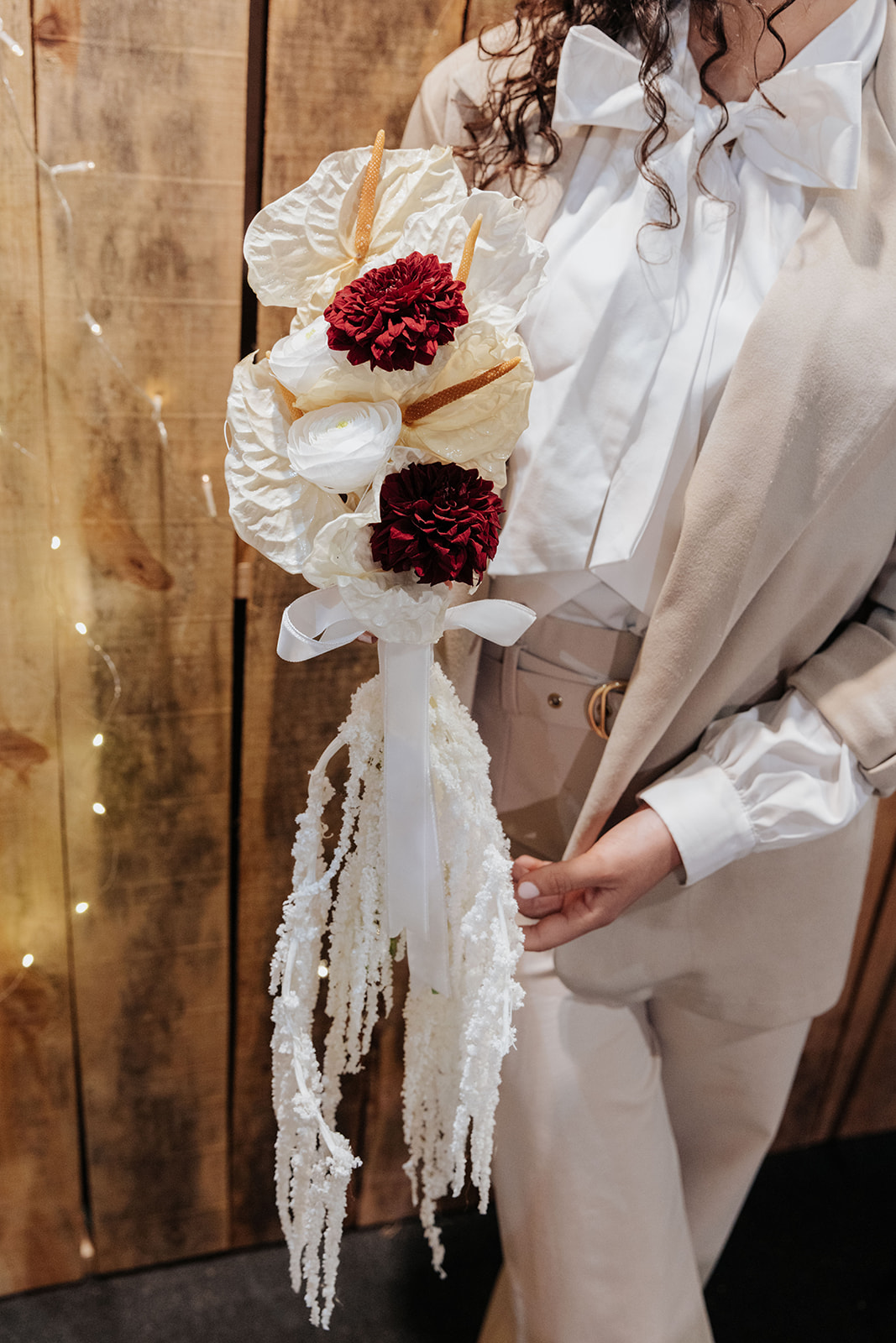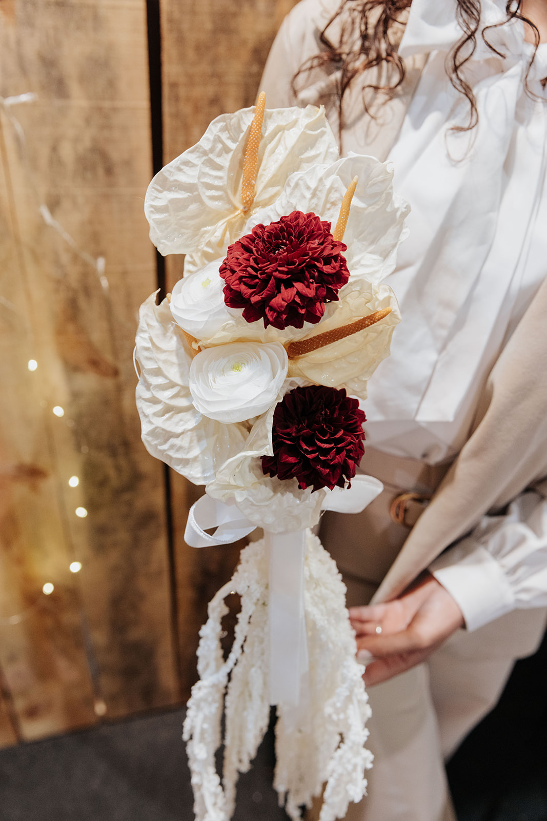 Ramo tamaño M 100% personalizado, compuesto de Anthurium preservados, Dalias preservadas, Amarantos preservados.