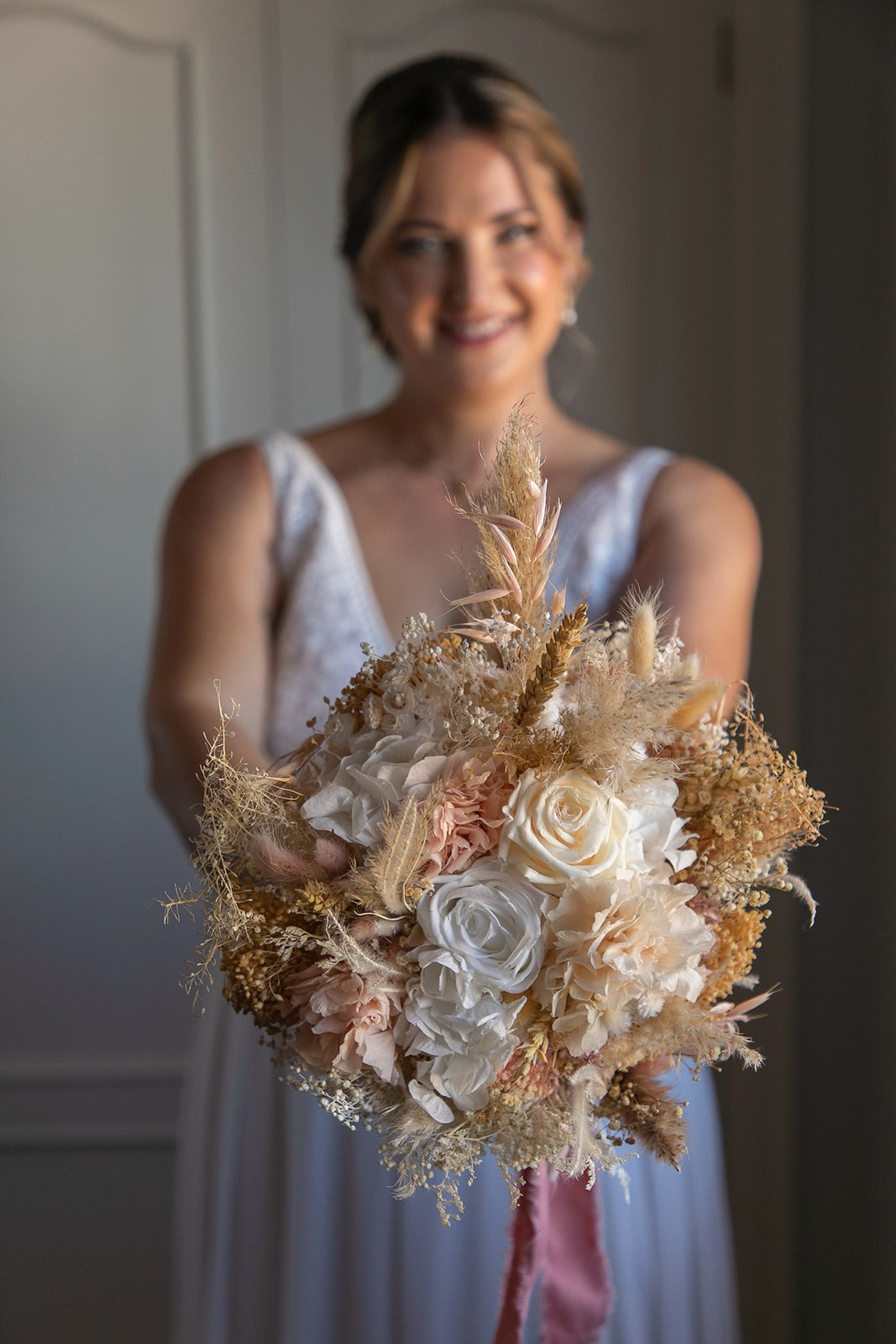 Ramo tamaño M silvestre 100% personalizado, compuesto por Hortensia preservada, Pampa, Rosa premium y Paniculata preservada y variado de flores silvestres.